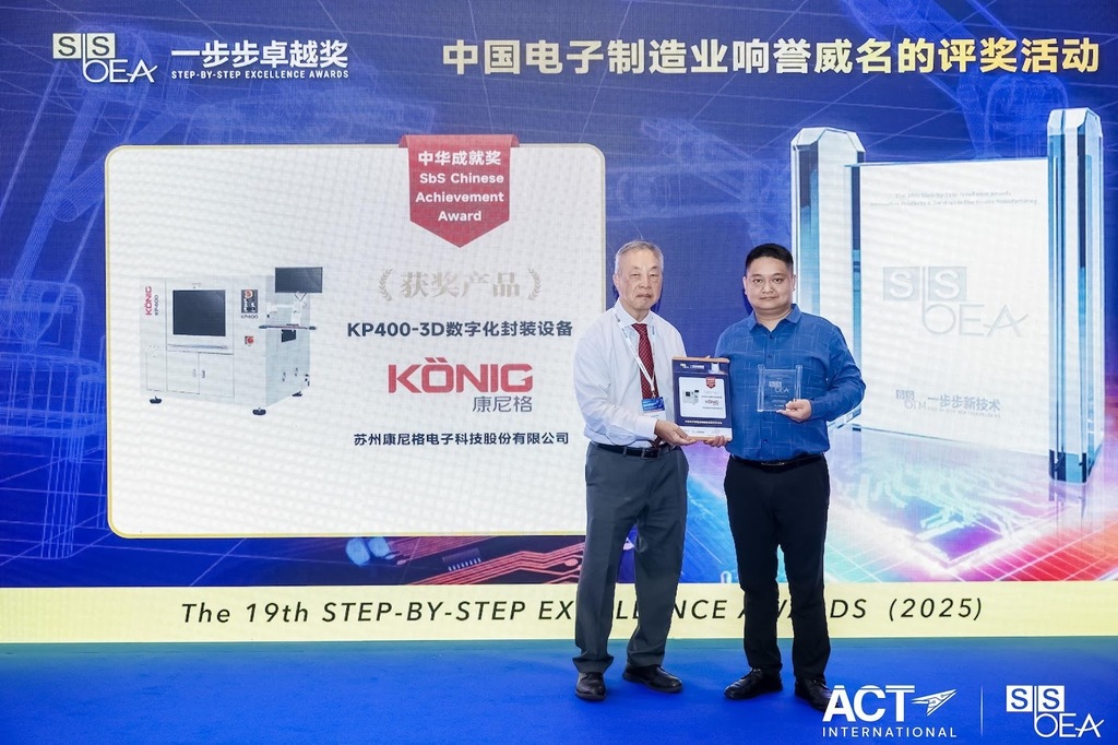 Shenzhen, China ― November 2025 ― KONIG, a leader in electronic packaging protection solutions, received two major awards on the opening day of NEPCON Asia for its breakthrough 3D Digital Packaging Equipment KP400. The 19th Step-by-Step Excellence Awards (SbSEA), one of China’s top recognitions in electronics manufacturing, were announced on October 28. KONIG’s system earned both the SbS China Achievement Award and the SbS Innovation Award, recognizing its leading contribution to China’s electronics manufacturing sector.