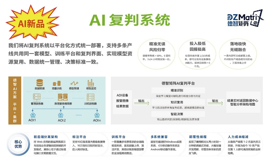 德智现已成长为一家技术领先的AI垂类大模型软件及智能检测设备科技集团,主营产品AI Review Software、AVI、AI AOI、SPI 及 Laser marking,已覆盖PCB、PCBA、Mini LED、半导体、新能源、陶瓷新材料等诸多领域,销售及服务网络遍布全球十余个国家及地区。德智的AI复判系统以平台化方式统一部署,支持多条产线共用同一套模型、训练平台和复判界面、实现模型资源复用、数据统一管理、决策标准一致。