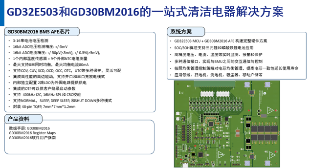 第三款为一站式清洁电器解决方案,由GD32E503 MCU与GD30BM2016 BMS AFE芯片构建完整硬件架构。其中,GD30BM2016 BMS AFE芯片功能强大,支持3-16串电池电压检测;16bit ADC电压检测精度达±5mV;内置1个温度传感器且可外接9个NTC电阻测温;最大支持8串同时均衡,最大均衡电流80mA;支持COV,CUV,SCD等多种保护;集成高性能的高边驱动,支持并口和串口充放电模式。整套方案支持三元锂与磷酸铁锂电池的SOC/SOH算法,具备电压、电流、温度等参数的实时监测、报警及保护功能,拥有多种通信接口以实现与BMU的交互控制,还能依据均衡管理策略对电芯进行均衡管理,提升电芯一致性并延长使用寿命。该方案可用于扫地机、洗地机、吸尘器、移动户储中。