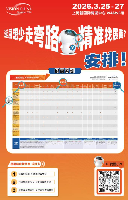 小V准备了超实用的展商索引——清晰标注各展商应用领域与展品类别。让您省去筛选麻烦,直奔目标展台。现在完成预登记报名并添加客服小V,展前免费发放这份实用指引,提前规划行程、锁定核心资源。早登记早省心,赶紧行动,解锁这场机器视觉行业盛宴!