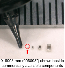 Even the 0201 mm (0.25 x 0.125 mm, 008004 inches) size component, which has long been considered the smallest standard among currently commercialized electronic components, will eventually reach its limits in the pursuit of higher density to integrate more electronic functions into limited board space. A next-generation component size, 016008 mm (006003"), is being developed in response. 016008 mm (006003") size components require approximately half of the placement area compared to 0201 mm size components, allowing for higher-density circuit designs.