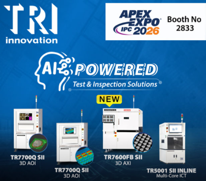 TRI’s lineup will feature the new 3D AXI TR7600FB SII, which incorporates an innovative X-ray imaging structure to address diverse product layouts and is optimized for specialized substrates, BGAs, multilayered structures, and SiP. The TR7600FB SII is the ideal choice for inspecting critical components that need to be imaged with high resolution, as the system allows the tube to get exceptionally close to the board without structural interference. Also presenting at IPC APEX 2026 will be the High Speed 3D AXI TR7600 SIII and the modular multi-core board tester TR5001 SII Inline.
